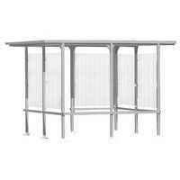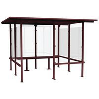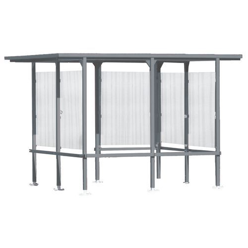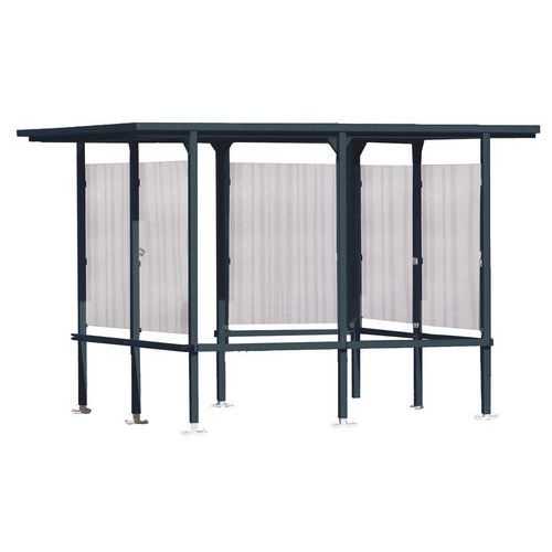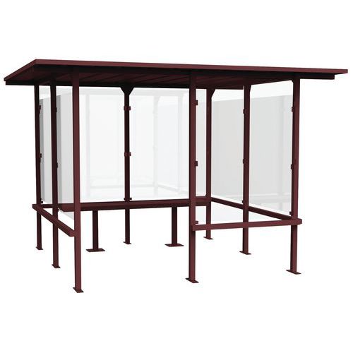 Verstelbare poten Constructie Kolommen en dwarsliggers van verzinkt stalen buis 50 x 50 mm (verzinkte staalbehandeling). Verstelbare voeten in hoogte (1,95 m op het laagste punt). Corrosiebestendige schroeven. Dakbedekking Verzinkte stalen bak, droog dakbedekkingssysteem Haironville, omrand met aluminium hoeken. Afwerking Thermodurcabele polyesterverf, gebakken op 200°C, UV-bestendig. Bekleding Helder gehard veiligheidsglas (Sécurit), dikte 4 mm. Industriële gepolijste afdichting. Bevestiging met aluminium glasbeugel. Bevestiging niet meegeleverd: Gebruik M12/65 ankerbouten op een betonnen plaat of betonnen voetstukken. Gebruik M12/120 draadeinden op een schone en vlakke asfaltlaag. De asfaltlaag moet minimaal 7 cm dik zijn.