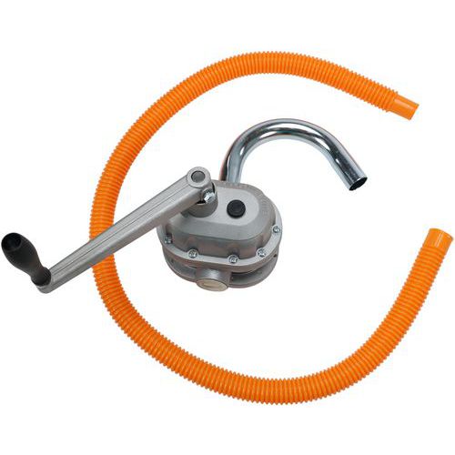 Rotatiepomp voor vloeistoffen met lage viscositeit. Met een gekalibreerd debiet van 1 liter per omwenteling biedt deze pomp een cruciale nauwkeurigheid voor het doseren en vullen van kleine of middelgrote containers. Geschikt voor vloeistoffen met lage viscositeit zonder oplosmiddelen of kerosine. Pomphuis van aluminium en dompelbuis van staal.