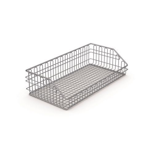 Rvs steriliseermand met fraaie afwerking van doorlopend draadwerk. Onberispelijke kwaliteit: zonder risico op scheuren van het papier. Goede circulatie van de sterilisatievloeistof dankzij de grote mazen. Eenvoudige grip met opening aan de zijkanten, uitsparing aan de voorzijde. Stapelbare mand, geschikt voor alle steunen en ook aan de bodem te bevestigen.