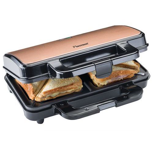 | Productnaam | Sandwich maker XL 4 driehoek sandwich zwart/koper Bestron, Vermogen: 900 W, Kleur: Zwart/bruin |