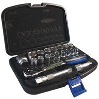 - Speciaal gereedschapstaal, gesmeed, gebruineerd, grepen blauw kunststof overtrokken.