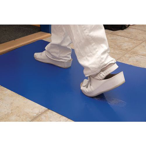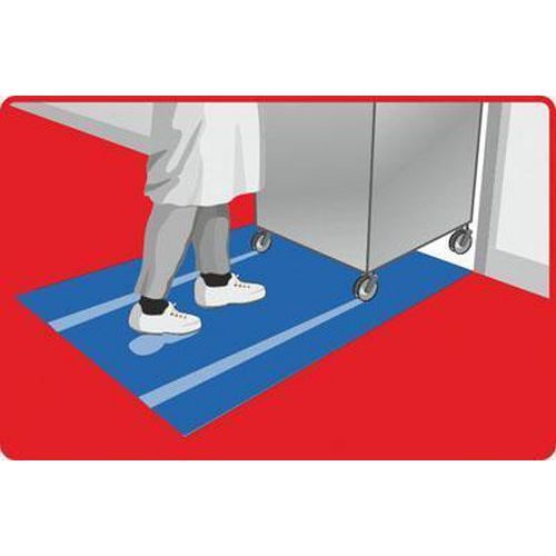Zelfklevende mat met antibacterieel bestanddeel. Wegwerplaag. Geschikt voor droge oppervlakken. Vangt vuil en stof van schoenen op. Zelfklevende mat met antibacterieel bestanddeel. Wegwerplaag. Geschikt voor droge oppervlakken. Vangt vuil en stof van schoenen op. Deze schoonloopmat met antibacterieel bestanddeel is geschikt voor droge oppervlakken. Het zelfklevende oppervlak van de afzonderlijke lagen met elk een hoogte van 35 micron vangt stof en vuil van schoenen of de wielen van vrachtwagens op. De lagen zijn voor eenmalig gebruik .Na gebruik kan de laag eenvoudig losgetrokken worden, zodat een nieuwe laag verschijnt.