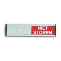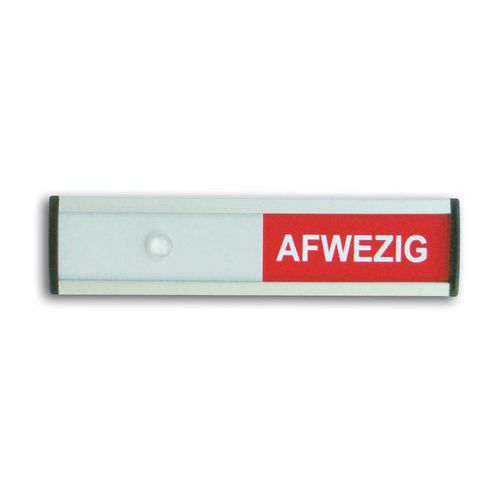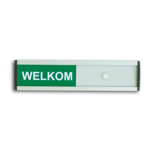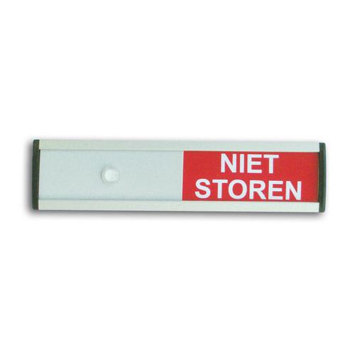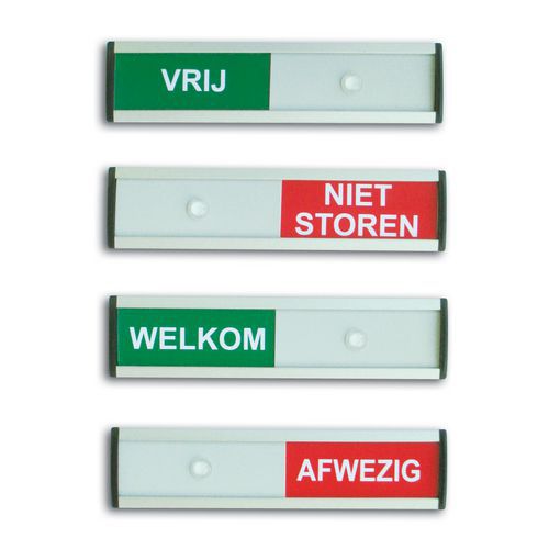 Uitsluitend geschikt voor gebruik binnenshuis. Verschuifbaar tekstvlak. Schuifbordje voorzien van een zelfklevende laag. Witte tekst op groene of rode ondergrond. Wanneer de cursor rechts staat wordt de tekst in het groen weergegeven, wanneer hij links staat wordt de tekst rood.
