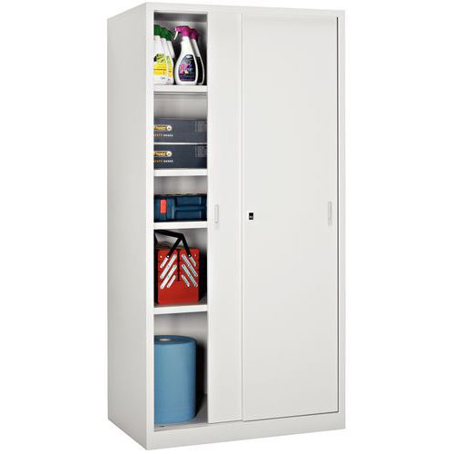 - Stevige hoge gelaste werkplaatskast met stalen schuifdeuren.