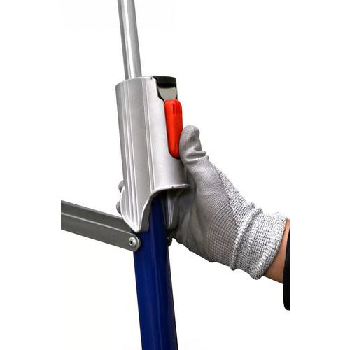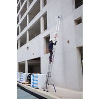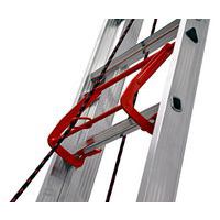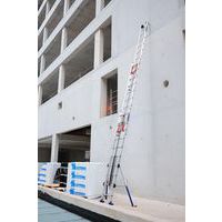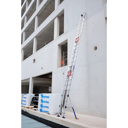 3-delige schuifladder met koord en inklapbare stabilisatoren die tot op de millimeter nauwkeurig kunnen worden versteld. Brede scharnierende antislipvoeten. De voeten worden plat op de ondergrond gehouden voor een stabiele en comfortabele plaatsing. Soepel en zonder vastlopen te verstellen, dankzij de draagrails met geleiders van polyamide. Gecontroleerd neerlaten van het schuifvlak: stalen valhaak met dubbele arm, bestand tegen 350 kg. Stabilisatoren met afstelling in millimeters voor een aanpassing aan alle soorten werkomgevingen. Voeten altijd perfect plat dankzij speciaal ontworpen richting van de sporten. Grote scharnierende laddervoeten uitgerust met een gekartelde antislipzool. Max. belasting (kg) : 150 Klantgarantie : 10 jaar