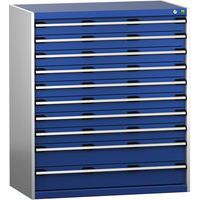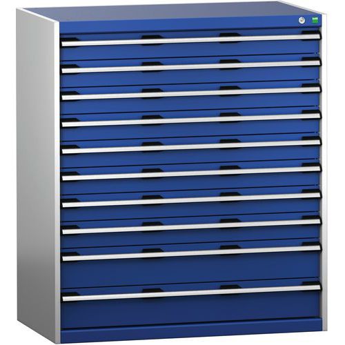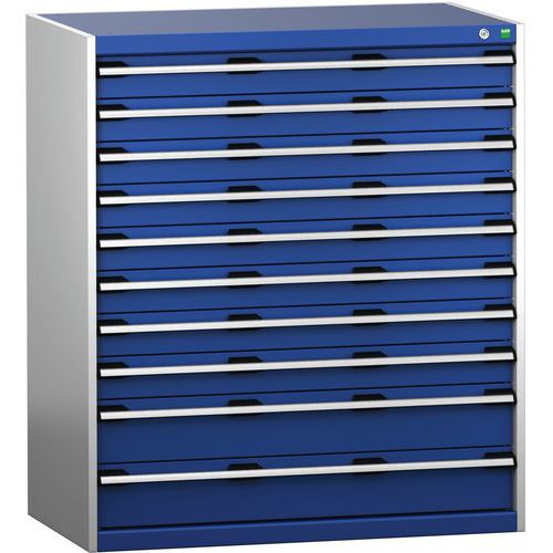 Schuifladenkast SL-10612-10.2. met 10 Schuifladen VS. RAL 7035/5010 Gemaakt in het UK Max. belasting (kg) : 1500