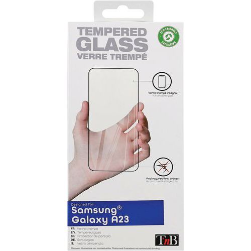 | Productnaam | Screenprotector in gehard glas voor Samsung Galaxy A23, Hoogte: 15.5 cm, Breedte: 70 mm, Materiaal: Glas |