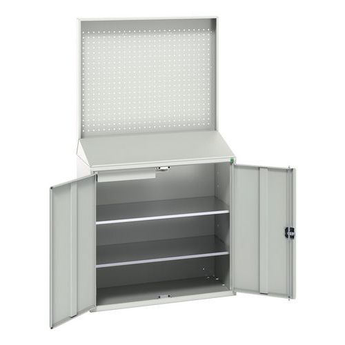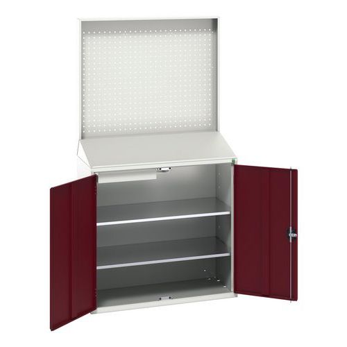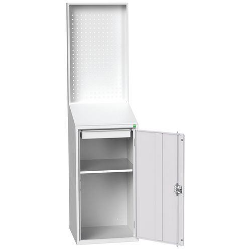 Servicepost voorzien van een geperforeerd achterpaneel en een hoge plank. Hellend schrijfoppervlak. Lage sokkel voorzien van 2 legborden in gegalvaniseerd staal en 1 lade. Versterkte dubbele deuren en geïntegreerde handgrepen. 100% lade-opening. Afsluitbaar met slot. Gemaakt in het UK