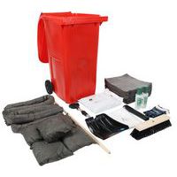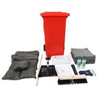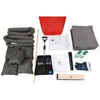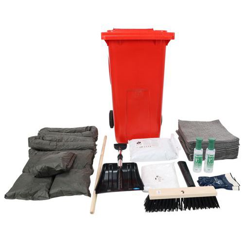 Inhoud: 100 absorberende vellen, 10 kussens, 10 rollen, 1 paar veiligheidshandschoenen, 1 combinatie voor eenmalig gebruik, 2 flessen voor oogspoeling 500 ml, 5 afvalzakken, 2 zakken met 10 kg korrels, 1 schop en 1 mop.