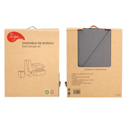 Bureauset SIGN Reborn. Van gerecycled papier en karton + polyurethaan. 4-delig: berging voor documenten, pennenbakje, A4-brievenbak en ordner.