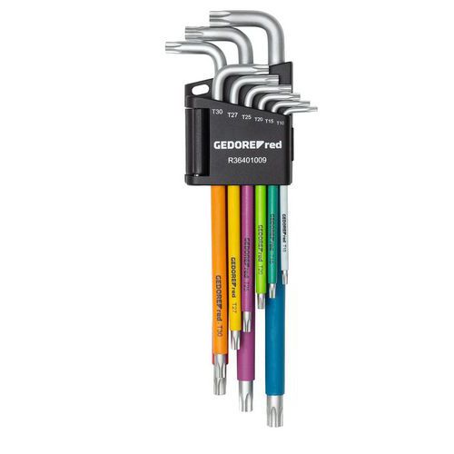 | Productnaam | Haakse Stiftsleutelset TX met kleurcodering 9-delig lang, Schroef uitsparing: Torx, Aantal sleutels: 9 |