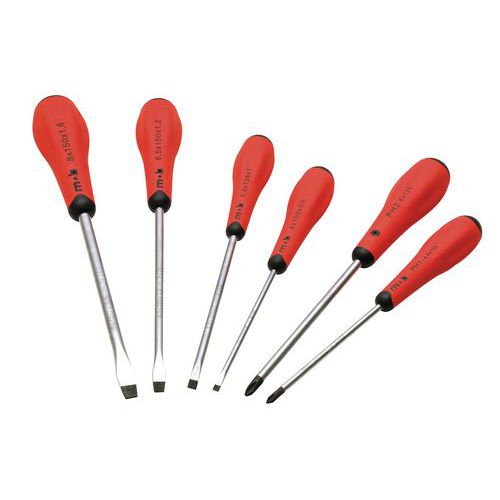 Gesmeed chroom-vanadium temperstaal Satijn verchroomd blad Neopreen en polypropyleen handvat Gefosfateerde klingpunt voor betere grip Geen risico op splinteren Smal toelopend schroevendraaierlichaam voor snel aandraaien Ronde kop aangepast aan de duwkracht, herkenbaar dankzij de kleurcode op elke schroevendraaier