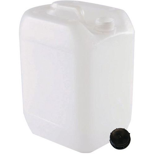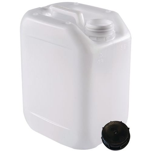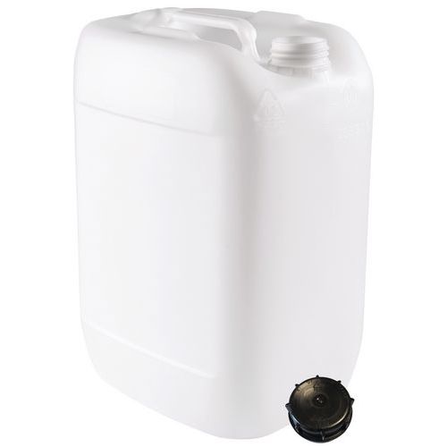 Kunststof jerrycan goedgekeurd voor het transport van goederen. Hoge bestendigheid tegen vallen, hydraulische druk en stapelen. De perfect dichte verpakking: bewezen door luchtdruktest. Jerrycan, comfortabel dragen en verplaatsen met bovenste handgreep. Grote opening met schroefdop, scharnierend en indicator voor opening.