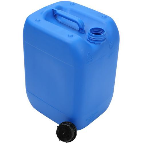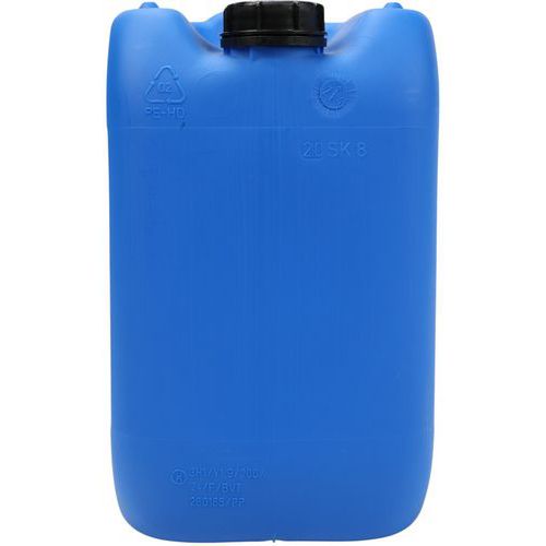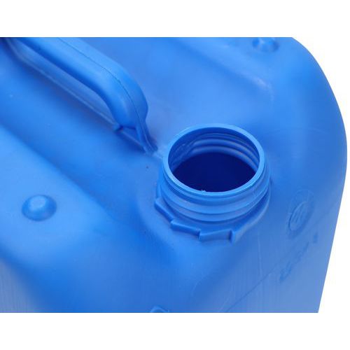 Kunststof jerrycan goedgekeurd voor het transport van goederen. Hoge bestendigheid tegen vallen, hydraulische druk en stapelen. De perfect dichte verpakking: bewezen door luchtdruktest. Jerrycan, comfortabel dragen en verplaatsen met bovenste handgreep. Grote opening met schroefdop, scharnierend en indicator voor opening.