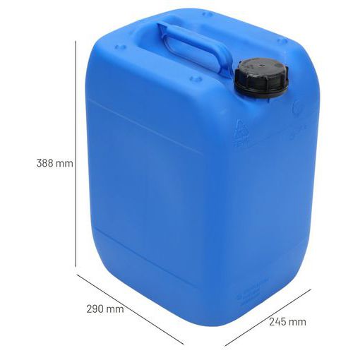 Kunststof jerrycan goedgekeurd voor het transport van goederen. Hoge bestendigheid tegen vallen, hydraulische druk en stapelen. De perfect dichte verpakking: bewezen door luchtdruktest. Jerrycan, comfortabel dragen en verplaatsen met bovenste handgreep. Grote opening met schroefdop, scharnierend en indicator voor opening.