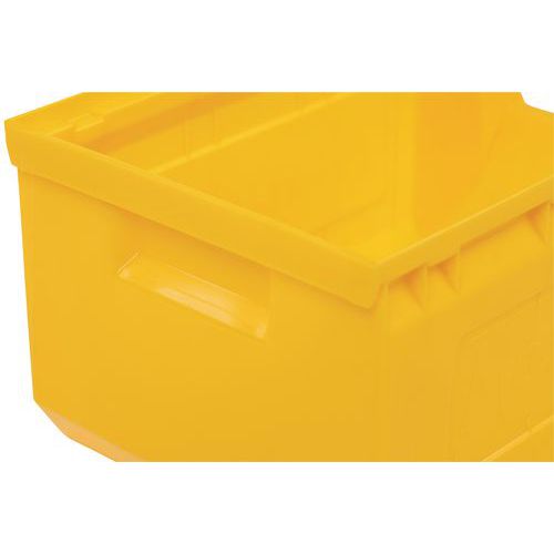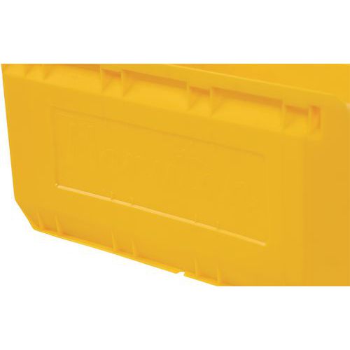 Randen met blokkering voor meer stabiliteit bij het stapelen. Grote stevigheid dankzij de zijdelingse groeven. Platte en slipvaste bodem voor het gemakkelijk vastpakken. Ligt uitstekend in de hand door de handgreep aan de voorkant. Zeer schokbestendige kunststof bak. Gemakkelijke identificatie door de etikethouder.
