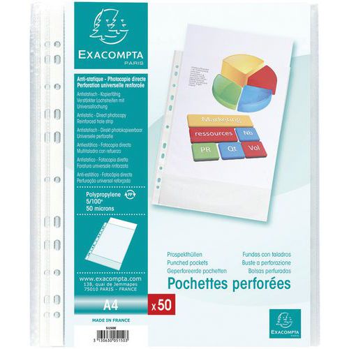 | Productnaam | Showtas geperforeerd in polypropyleen, Aantal hoesjes: 50, Kleur: Wit, Voor formaat: 210 x 297 mm (A4) |