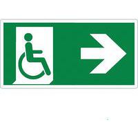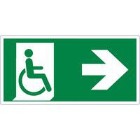 Dit evacuatiebord rechts geeft de nooduitgang aan voor gehandicapten. Ideaal voor openbare ruimtes.