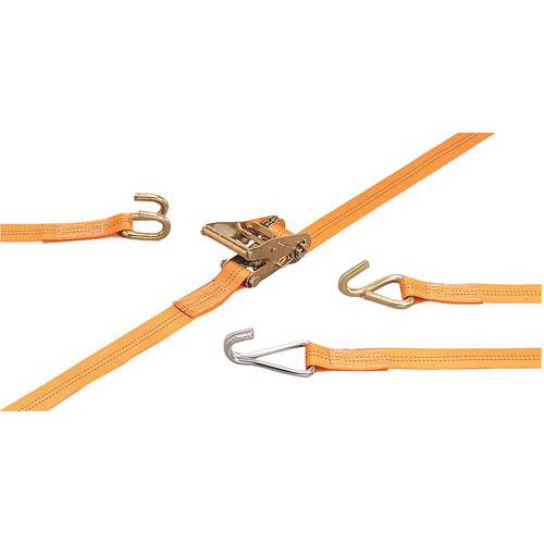 - Sluitsysteem met spanratel voor een geleidelijke aanspanning van de last en een continue belasting van de riem.
