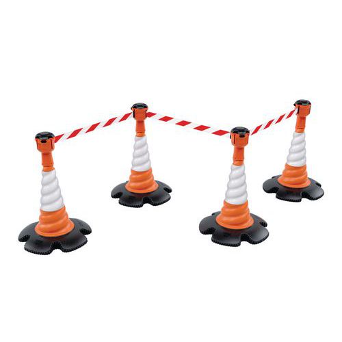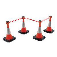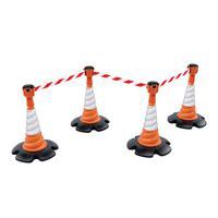 Elke eenheid heeft 9 meter volledig oprolbaar rood/wit of geel/zwart hoogwaardig stoffen tape.