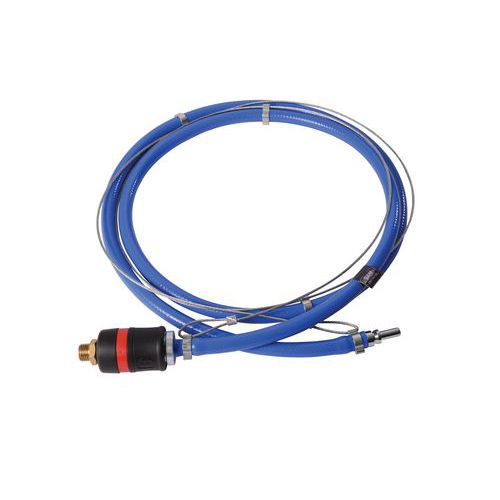 Specifieke mannelijke aansluiting voor aansluiting op de regelaar DIN-vrouwelijk aansluiting met een inwendige doorloopdiameter van 7,2-7,4 mm 1,70 m polyurethaan slang versterkt met een anti-klopper staalkabel die over de gehele lengte met meerdere bevestigingsmiddelen is verbonden. Ergonomie van het werk in de bewegingen