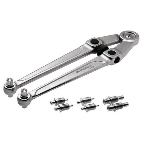 | Productnaam | Sleutel voor moeren met boorgaten op de bovenkant, Bek opening: 100 mm, Lengte: 245 mm, Gewicht: 530 g |