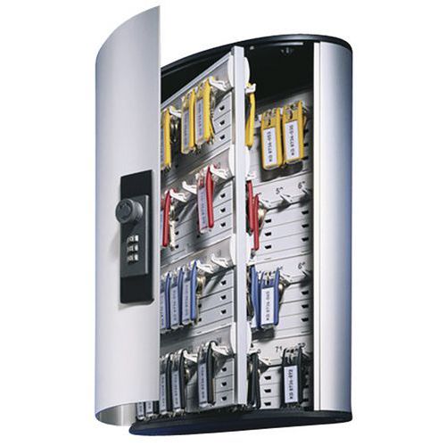 Design sleutelkast voor Key Clip sleutelhangers. Past zich aan de grootte van uw sleutels aan dankzij in hoogte verstelbare balkjes. Veiligheid gegarandeerd door het codeslot. Functioneel, de deur kan tot 90° geopend worden. De combinatie kan regelmatig gewijzigd worden: 1000 mogelijke combinaties. Voor het opbergen en organiseren van uw sleutelhouders Key Clip