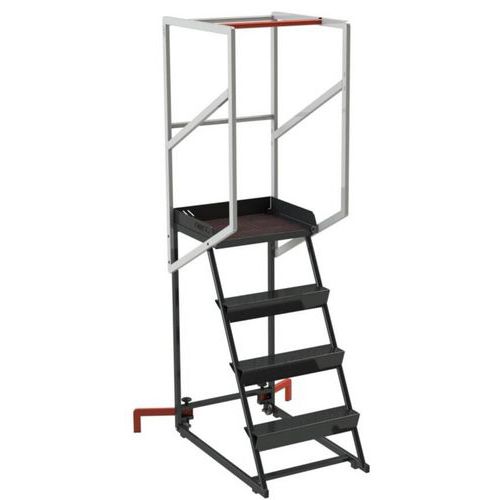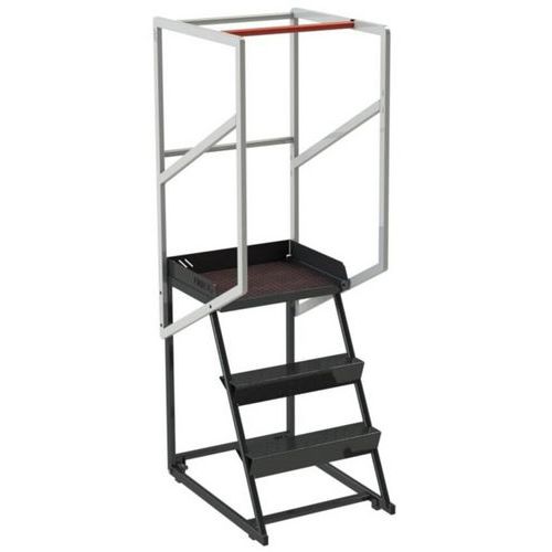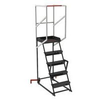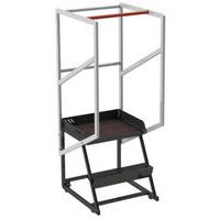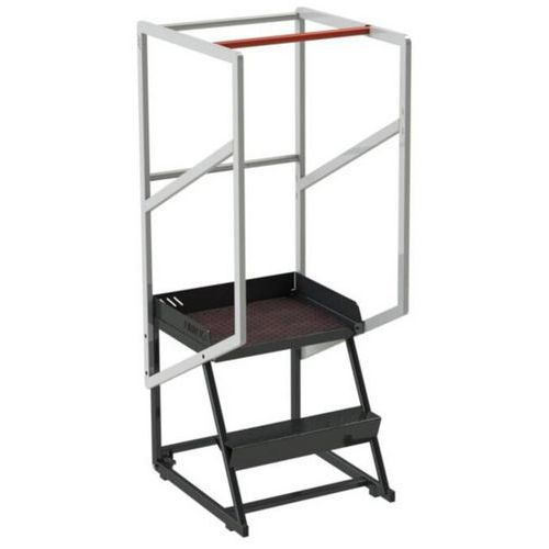 Smalle, rijdende trapladder met zelfdragende antisliptreden. Betrouwbaar en zeer veilig: geheel mechanisch gelaste constructie. Valbeveiliging, antislip-stootrand en valbeveiligingsstang. Platform van aluminium plaatstaal met antislip-traanplaat. Lichte, compacte en hanteerbare trapladder met niet-strepende wielen. Hoogte reling 1 m.