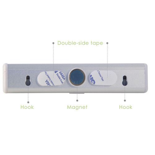 Eenvoudige montage: u kunt kiezen tussen 3 montageoplossingen 1) met dubbelzijdig klittenband (meegeleverd), snel te installeren/verwijderen, 2) met pluggen/schroeven, 3) met magneet voor plaatsing op metalen oppervlakken.