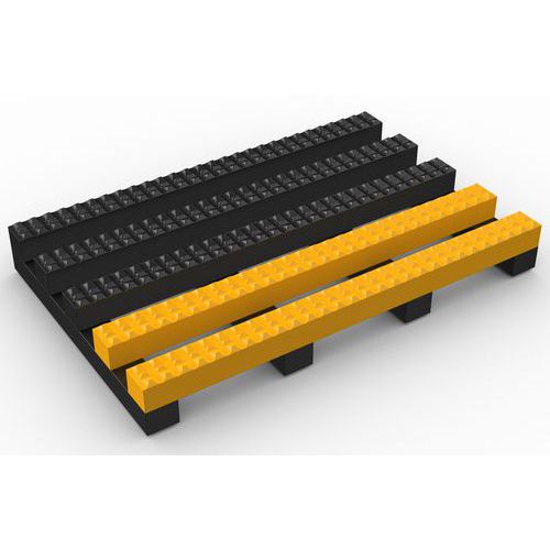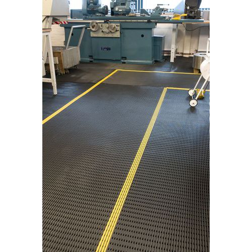 Soepel antislip- en antivermoeidheidsrooster per strekkende meter. Uitstekende afvoer van vloeistoffen en kleine vuildeeltjes. Gele afgeschuinde rand vereenvoudigt de doorgang. Antislipoppervlak met diamantpuntprofiel. Verhoogde productiviteit en verminderde vermoeidheid.