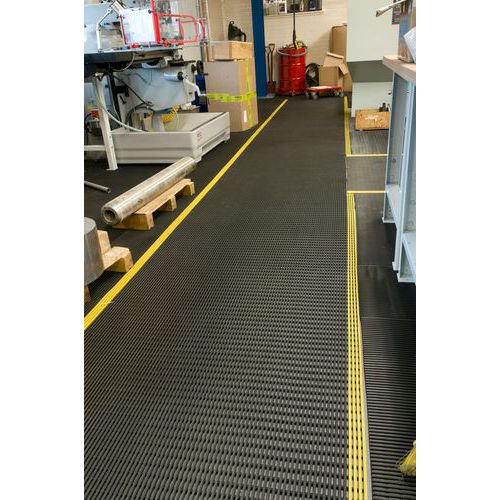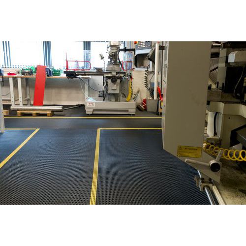 Soepel antislip- en antivermoeidheidsrooster op rol. Gele afgeschuinde rand vereenvoudigt de doorgang. Uitstekende afvoer van vloeistoffen en klein afval. Antislipoppervlak met diamantpuntprofiel. Verhoogde productiviteit en verminderde vermoeidheid.