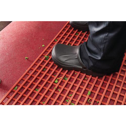 Soepel rooster voor een omgeving met voedingsmiddelen, bestand tegen dierlijke vetten. Gegarandeerde veiligheid in ruimten waar dierlijk materiaal wordt verwerkt. Extra groot, opengewerkt rooster zodat afval erdoor heen kan. Rooster gemaakt met schimmelwerende en antibacteriële additieven. Eenvoudig te hanteren en eenvoudig te reinigen voor een perfecte hygiëne. Gemaakt in het UK Tapijt gebruik : Zeer intensief Rol