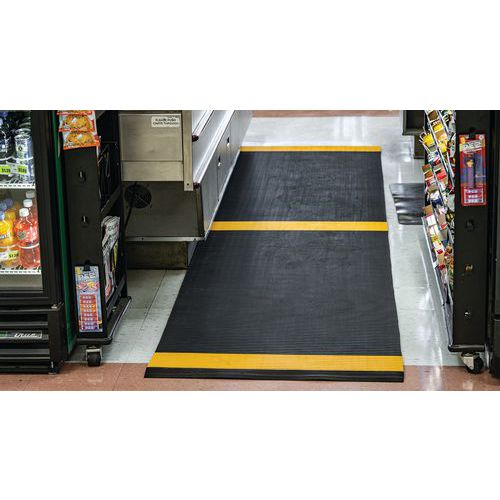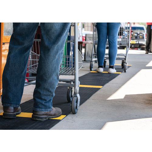 Rooster van soepel PVC met zwart / gele stroken, voor het houden van minimaal 1,5 meter afstand. Uitstekende akoestische absorptie, zeer comfortabel voor mensen die staand werken in voornamelijk statische houdingen en geschikt voor vloeren met oneffenheden. Gemaakt van niet-poreus PVC, voor een natuurlijke weerstand tegen de groei van bacteriën. Constructie met 2-laagse cross-coating, met open PVC-rooster voor een uitstekende afvoer van vloeistoffen. Eenvoudig te reinigen: optillen of oprollen en reinigen met een hogedrukslang. Helpt bij het waarborgen van de afstand van anderhalve meter tussen personen (bezoekers, klanten, werknemers)