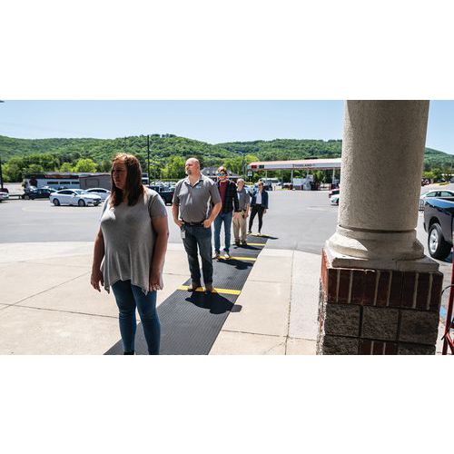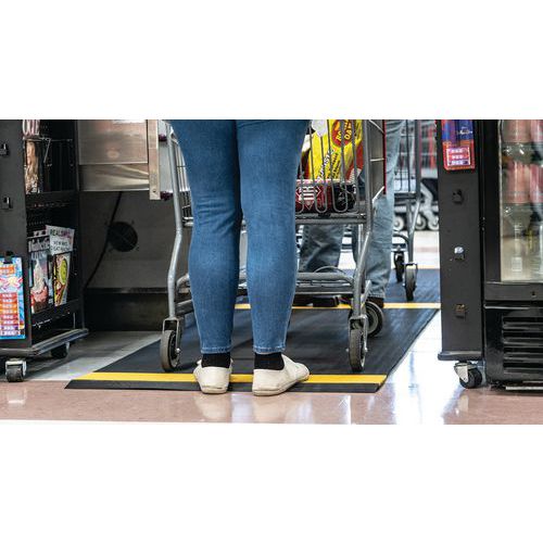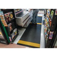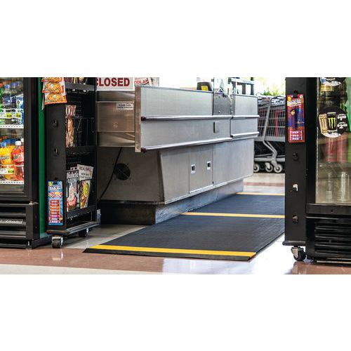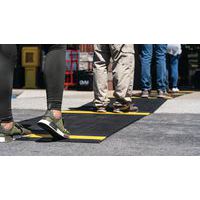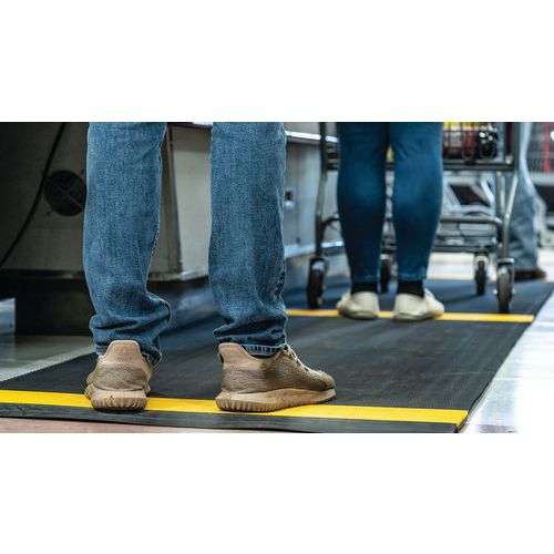 Rooster van soepel PVC met zwart / gele stroken, voor het houden van minimaal 1,5 meter afstand. Uitstekende akoestische absorptie, zeer comfortabel voor mensen die staand werken in voornamelijk statische houdingen en geschikt voor vloeren met oneffenheden. Gemaakt van niet-poreus PVC, voor een natuurlijke weerstand tegen de groei van bacteriën. Constructie met 2-laagse cross-coating, met open PVC-rooster voor een uitstekende afvoer van vloeistoffen. Eenvoudig te reinigen: optillen of oprollen en reinigen met een hogedrukslang. Helpt bij het waarborgen van de afstand van anderhalve meter tussen personen (bezoekers, klanten, werknemers)