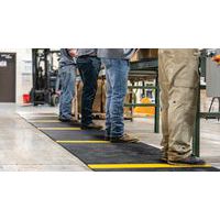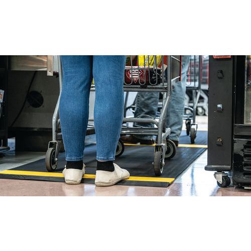 Rooster van soepel PVC met zwart / gele stroken, voor het houden van minimaal 1,5 meter afstand. Uitstekende akoestische absorptie, zeer comfortabel voor mensen die staand werken in voornamelijk statische houdingen en geschikt voor vloeren met oneffenheden. Gemaakt van niet-poreus PVC, voor een natuurlijke weerstand tegen de groei van bacteriën. Constructie met 2-laagse cross-coating, met open PVC-rooster voor een uitstekende afvoer van vloeistoffen. Eenvoudig te reinigen: optillen of oprollen en reinigen met een hogedrukslang. Helpt bij het waarborgen van de afstand van anderhalve meter tussen personen (bezoekers, klanten, werknemers)