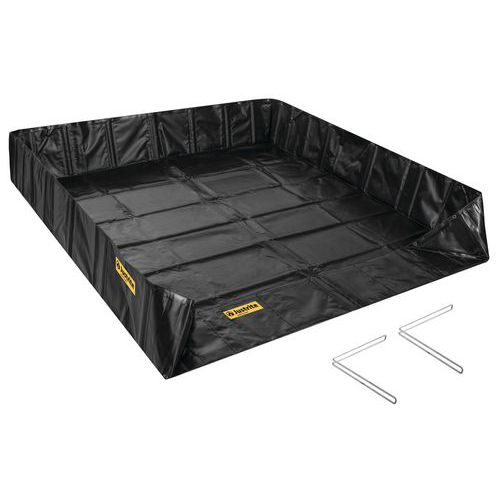 De flexibele opvangbak met hoekbeugel QuickBerm® is licht genoeg voor transport. Sterk genoeg voor intensief gebruik buiten en in barre omgevingen. Ontworpen voor statische configuraties, ideaal voor toepassingen waarbij minimale beweging vereist is. Flexibele opvangbakken zijn essentieel voor de opslag van chemische producten en buiten geplaatste of tijdelijke generatoren. De QuickBerm met hoekbeugel is een voordelige optie als secundaire insluitlaag bij aftappen. Licht genoeg voor transport, maar sterk genoeg voor het dragen van voertuigen, generatoren, transformatoren, gepalletiseerde vaten of andere gevaarlijke materialen te bevatten. Om de QuickBerm met hoekbeugel op te stellen, hoeft u deze alleen uit te klappen de hoekbeugels in de muur aan te brengen.