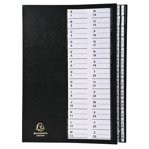 | Productnaam | Sorteermap Ordonator 26 indelingen alfabetische tabs van A-Z Exacompta, Aantal tabs: 26, Kleur: Zwart |