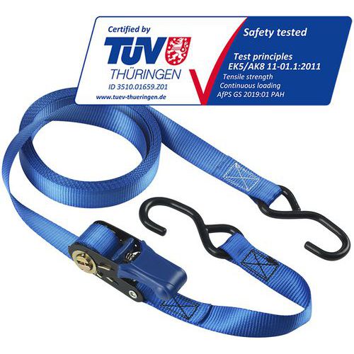 | Productnaam | Spanband Master Eco met S-haken en ratel, Lengte: 5000 mm, Veilig hefvermogen: 300 kg, Breedte: 25 mm |