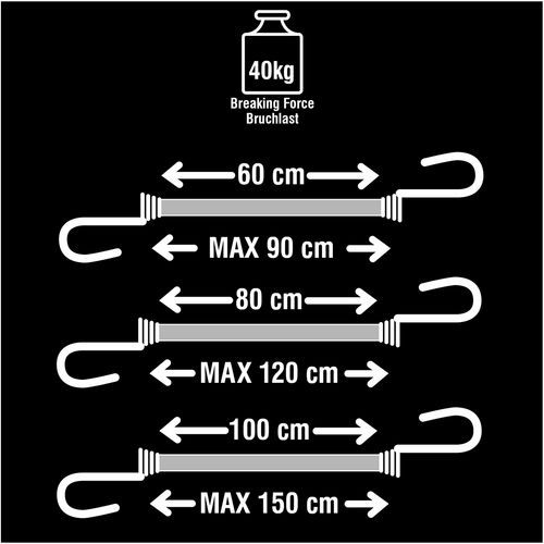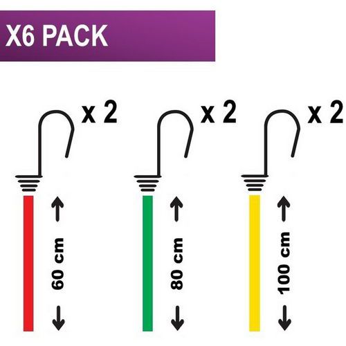 - Set van 6 spanners met dubbele haak (2 x 60 cm + 2 x 80 cm + 2 x 100 cm) met een diameter van 8 mm.