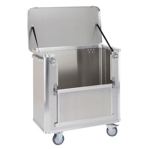Containerwagen van aluminium voor universeel gebruik. Hygiënisch, geurloos en roest niet. Ergonomisch en eenvoudig in gebruik, zelfs bij maximale belasting. Glad oppervlak met wanden zonder ribbels, voor een eenvoudige reiniging. De neerklapbare wand wordt in geopende stand gehouden dankzij twee magneten. Deksel met scharnieren, 2 bevestigingsriemen en 2 sluitingen met hendel. Hellende bodem met 2 afvoeropeningen die uitgerust zijn met een afvoerklep, dop en ketting. De bodem is afgedicht met silicone. Geanodiseerde handgrepen op de twee wanden aan de voorzijde.