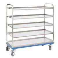 Aluminium wagen met legborden, geschikt voor het transport van stapelbakken. Ergonomisch en eenvoudig te hanteren, zelfs bij maximale belasting. Optimale zichtbaarheid en rechtstreekse toegang tot de inhoud. Zeer stabiel en van hoge kwaliteit dankzij de gelaste legborden. Eenvoudige toegang, er hoeft geen deur geopend te worden. Zonder deur. Geschikt voor het naleven van de gezondheidsvoorschriften