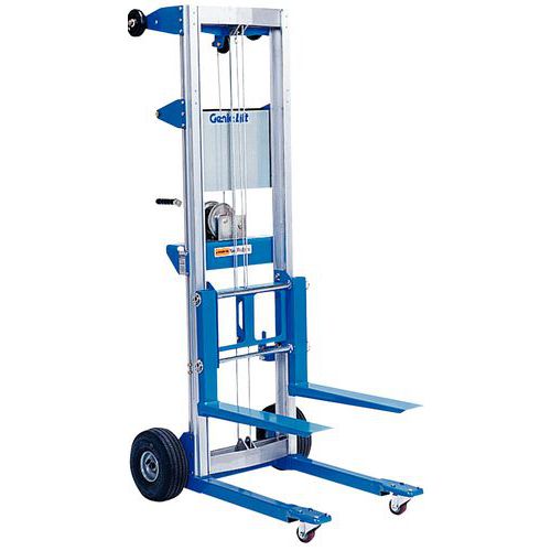 - Ergonomische handstapelaar uitgerust met stalen vorken en een handmatige lier om de last eenvoudig op de gewenste hoogte te houden.