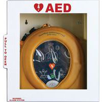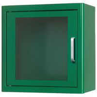 Afsluitbare dubbeldeurskast met eerstehulpmarkeringen, ideaal voor gebruik in eerstehulpbehandelkamers.