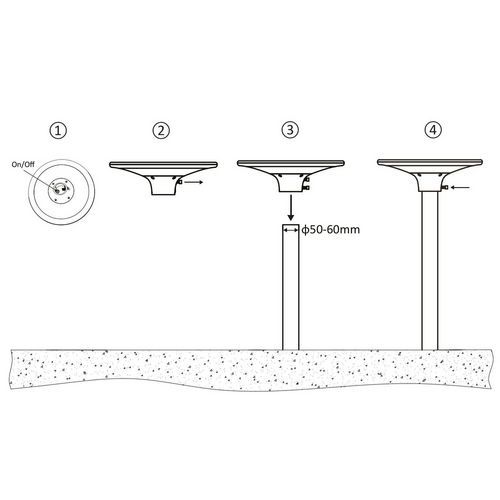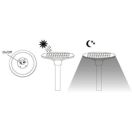 Staande ledlamp op zonne-energie van UV-bestendig polycarbonaat en ABS. Eigentijds en zeer verfijnd ontwerp. Schok- en weerbestendig. Het elektronische gedeelte is bijzonder waterbestendig (IP65). Werking: de lamp wordt overdag met zonlicht opgeladen. De lamp gaat ‘s avonds automatisch aan: de eerste 3 uur met een lichtsterkte van 100%, de volgende 2 uur met een lichtsterkte van 70% en daarna met een lichtsterkte van 50% tot de ochtend (of totdat de batterij leeg is). De lamp past met het slimme regelsysteem de helderheid aan, afhankelijk van de dynamische capaciteit van de batterij. De lamp heeft de nieuwste generatie SMD-LED, een hoogwaardige diffuser en gelijkmatig 4000K licht: niet te warm en niet te koud. Dankzij het monokristallijn zonnepaneel van 11,5 W en een Li-Ion-batterij van 6000 mAh heeft de lamp een autonomie van ten minste 32 uur (afhankelijk van hoeveel de lamp overdag opgeladen is ) – dit ligt ruim boven de marktnormen. Te bevestigen aan een 60mm mast (compatibel met d