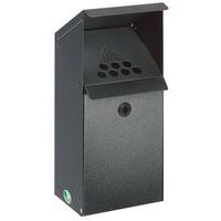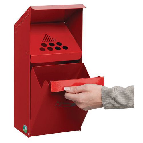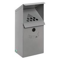 Muurasbak voor buiten met houder en beschermingsdak. Gemaakt van gegalvaniseerd plaatstaal, met hoogwaardige poedercoating van in de oven gebakken en uv-bestendig epoxy-polyester. De asbak is beveiligd door een sleutel voor toegang door geautoriseerde personen. Muurasbak voor buiten met grote capaciteit en beschermingsdak