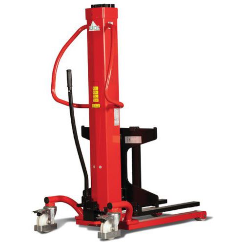 Handbediende stapelaar met hydraulische hefwerking, zeer compact en ideaal voor kleine ruimtes.