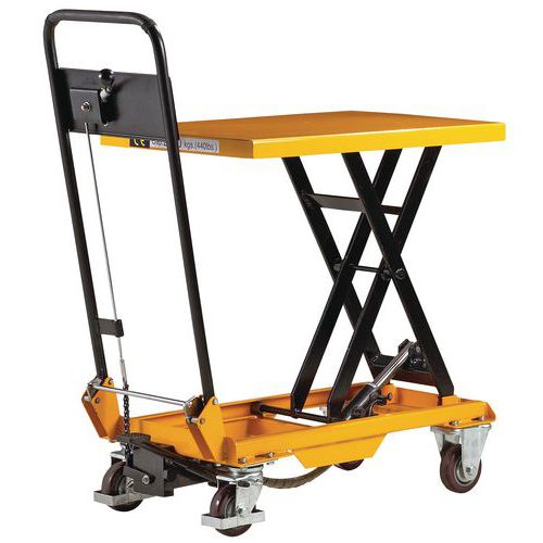 - Handmatige heftafel met dubbele schaar. Een voordelige tafel voor het heffen, laten zakken en transporteren van lasten tot 350 kg. Ideaal voor het verplaatsen en op hoogte plaatsen van zware lasten. Deze heftafel is licht, neemt weinig ruimte in, is eenvoudig te transporteren en vereist slechts weinig onderhoud. Een onmisbaar hulpmiddel om de productiviteit te optimaliseren en tegelijkertijd de gezondheid van werknemers te beschermen. Uitgerust met 2 vaste wielen en 2 zwenkwielen van polyurethaan.