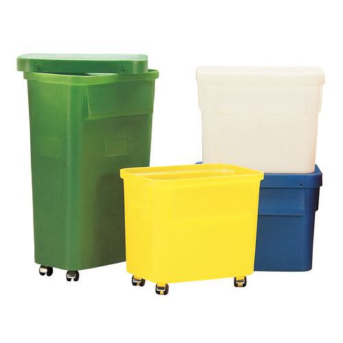 Gemakkelijk te verplaatsen door de wieltjes. Makkelijk herkenbaar dankzij de verschillende kleuren. Een grote schrijfruimte voor een snelle identificatie op de bak. Goed sluitend door het deksel met klemmen. Gemakkelijk te reinigen en te legen. Gemaakt in de EU
