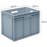 | Productnaam | Stapelbare Euronorm-bak grijs Rako, Totale inhoud: 90 L, Stapelbaar: ja, Totale hoogte: 426 mm |