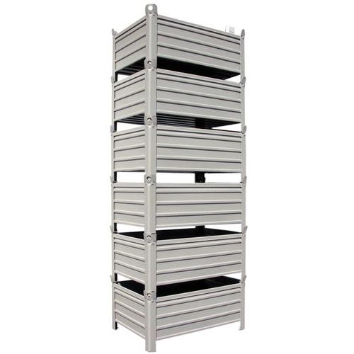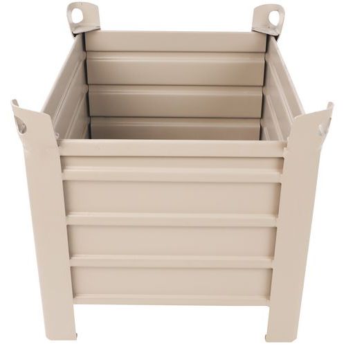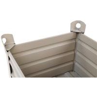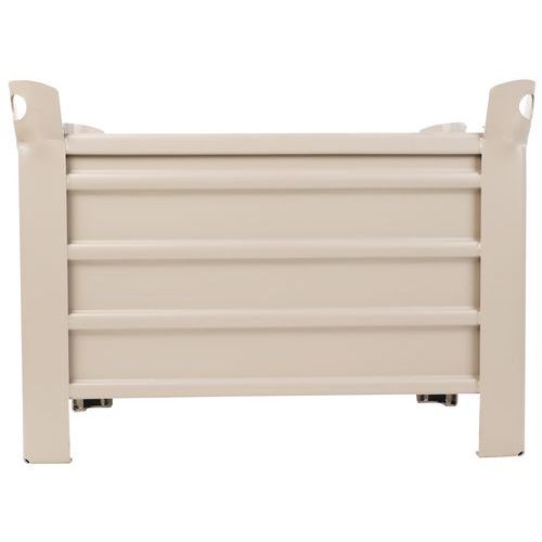 Zeer bestendige palletkist van gegolfd plaatstaal. Ruimtebesparing: tot 5 palletkisten stapelbaar. Zeer stabiel bij het stapelen dankzij de hoekprofielen. Uitklapbare versie. Dikte van plaatstaal: bodem 2 mm, wand 1,5 mm, hoekstuk 4 mm.